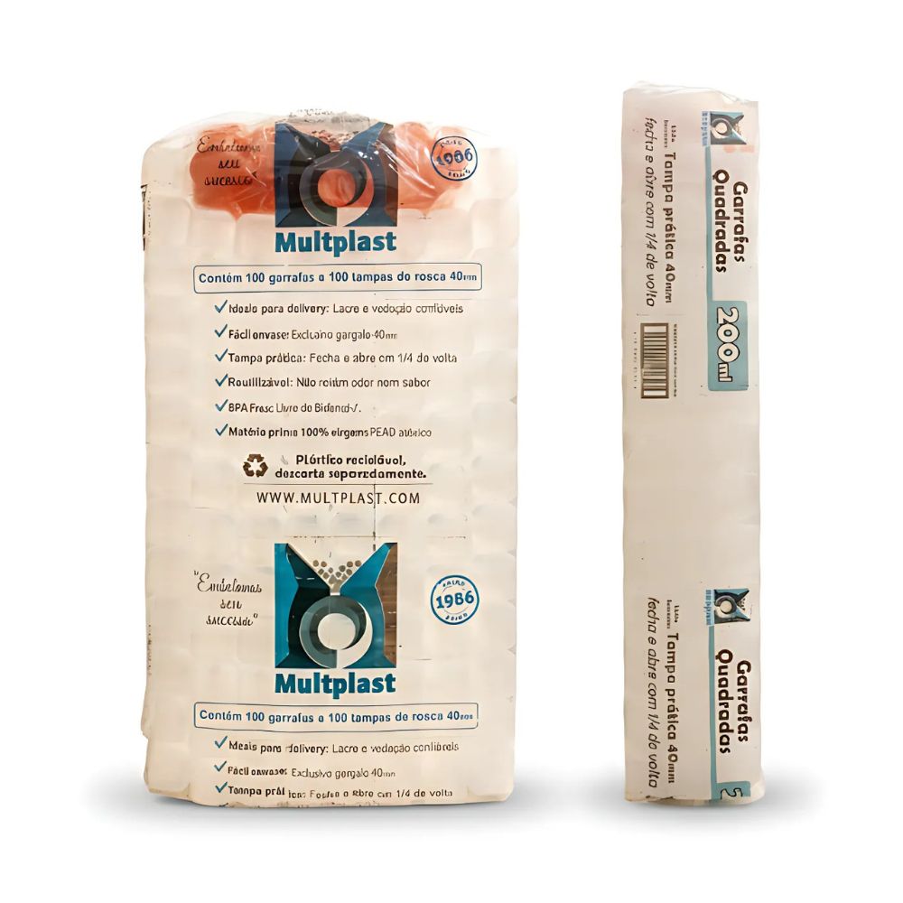 Garrafa Quadrada com Rosca – 200 ml, pacote com 100 unidades. Prática e resistente, ideal para armazenar molhos, temperos e líquidos, garantindo higiene e facilidade no uso.